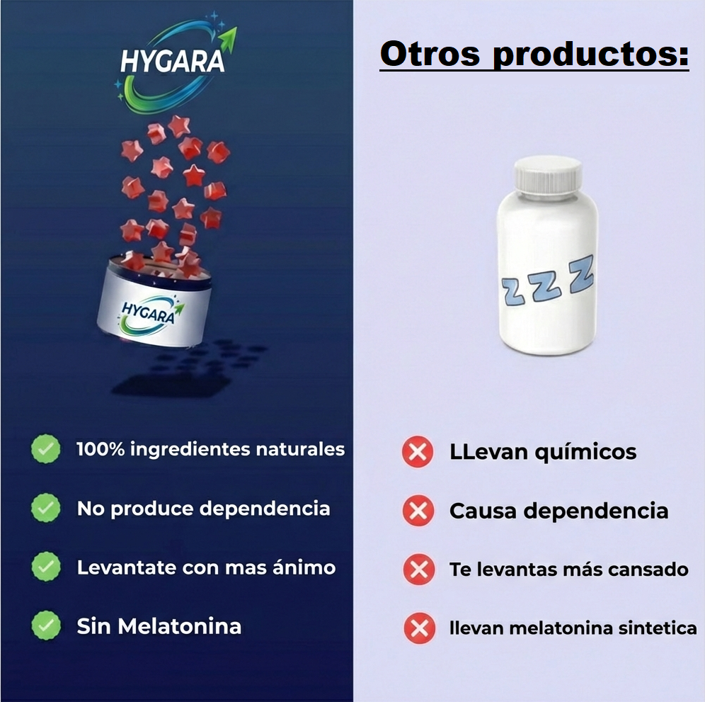 Hygara contiene productos 100% Naturales: Extracto de Valeriana, Pasiflora, Magnesio. Sin químicos. Apto para veganos y sin alérgenos.